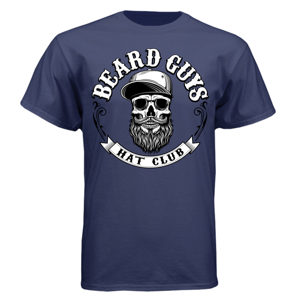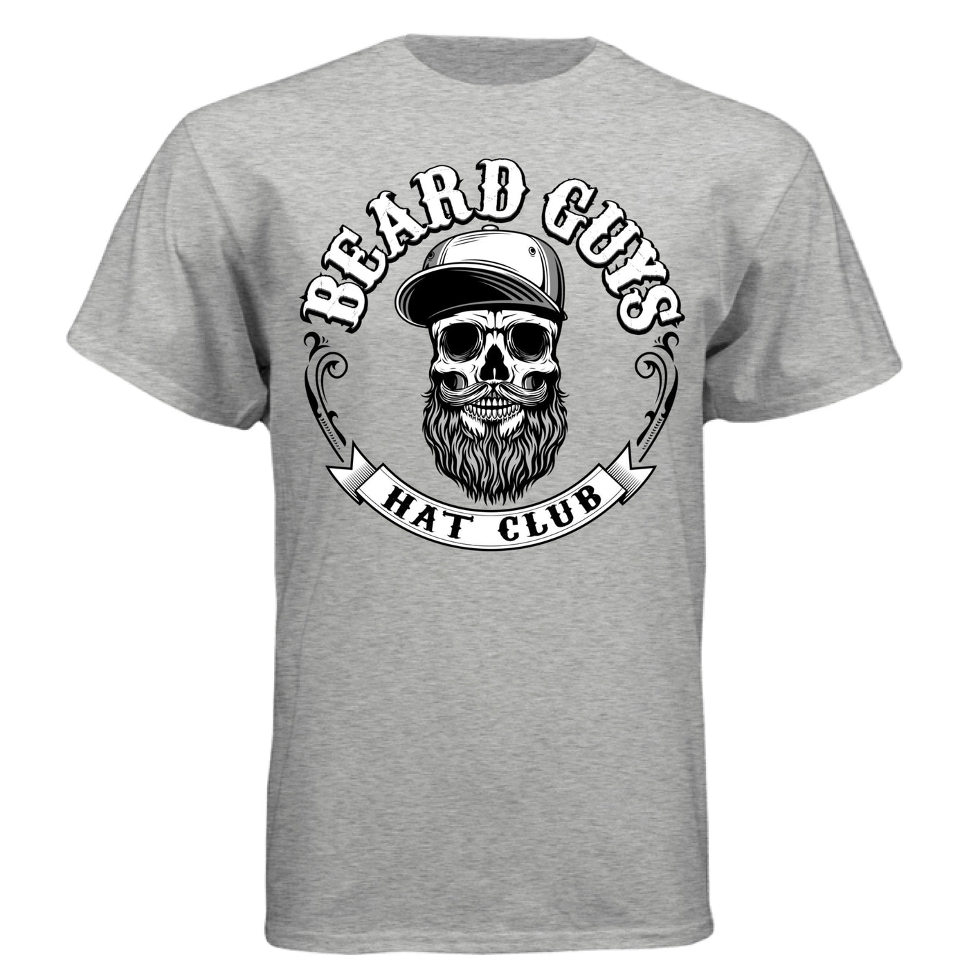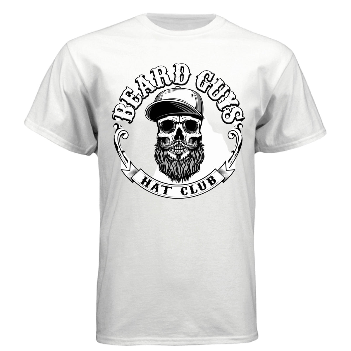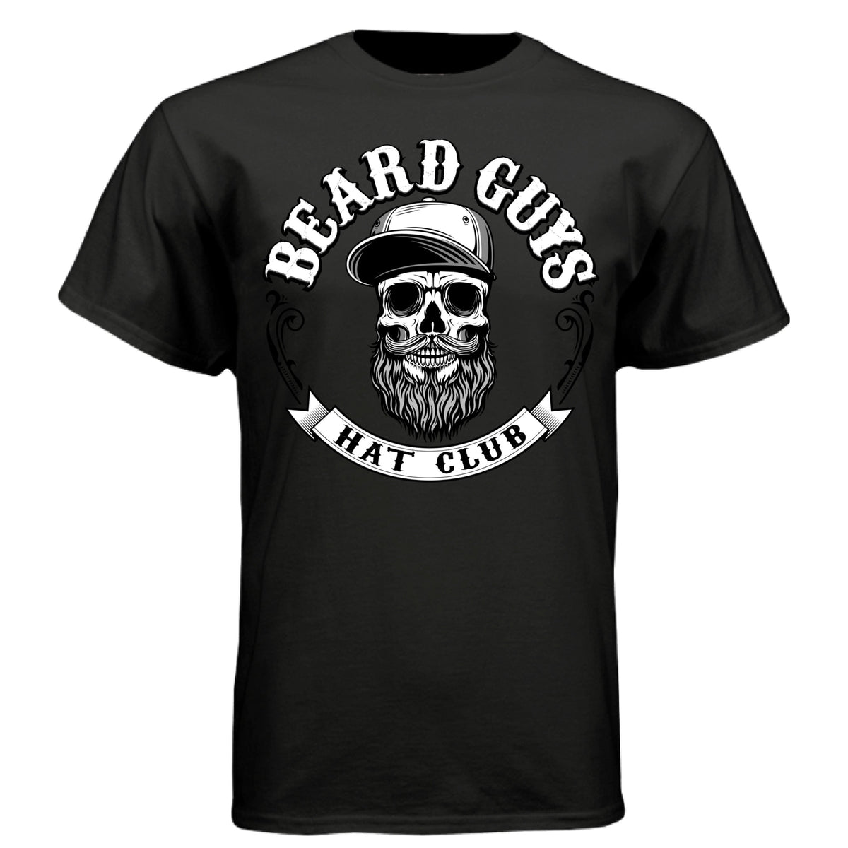 Showcase rugged style, masculinity, and fearless personality with the Beard Guys Hat Club graphic tee shirt. This bold design features a detailed skull with a full beard, mustache, and classic cap, blending beard culture apparel, tattoo-inspired graphic tees, urban streetwear fashion, and masculine statement shirts for men.